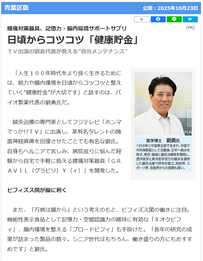 当社代表の劉勇がタウンニュース(青葉区版)にて紹介されました。 投稿日 2025年10月24日 著者 drjcadmin カテゴリー メディア 当社代表の劉勇がタウンニュース(青葉区版)にて紹介されました。 日頃からの「健康貯金」について語っております。 タウンニュース公式サイトはこちら。